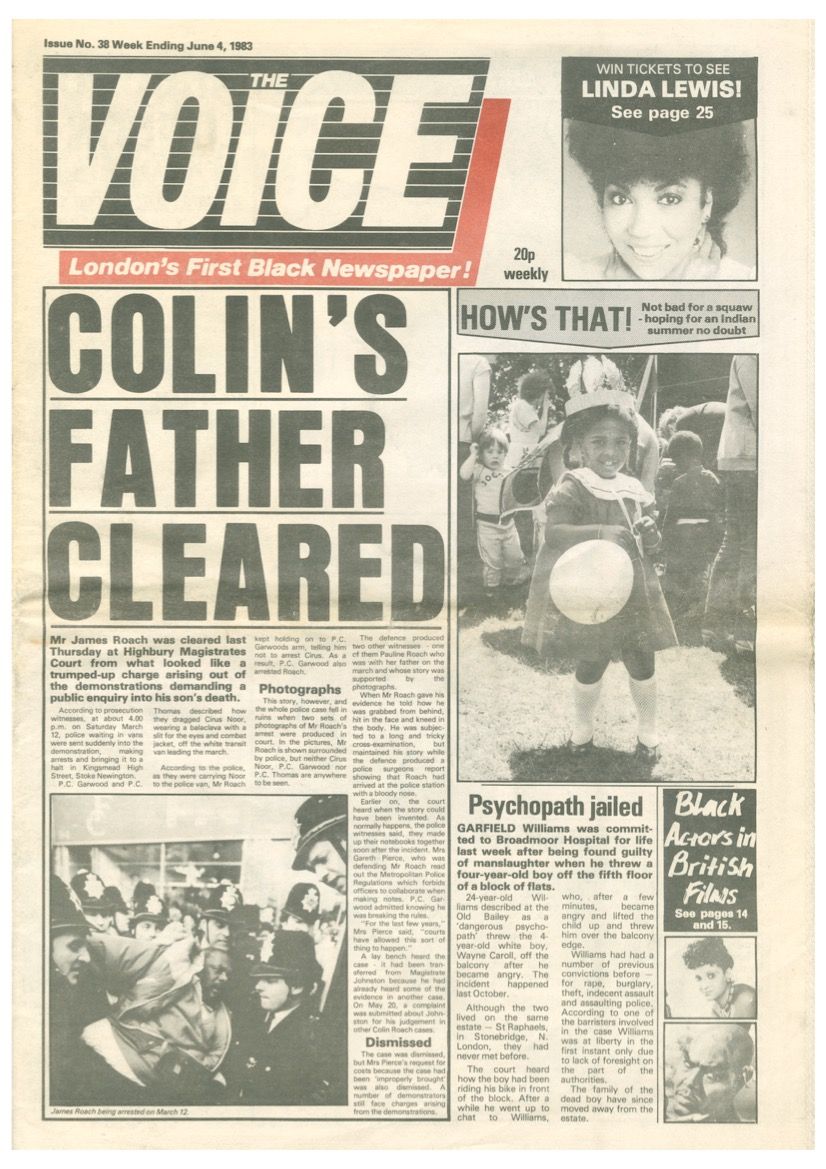 Report in The Voice following the dismissal of charges against James Roach, arrested at a demonstration demanding a public enquiry into his son's death.