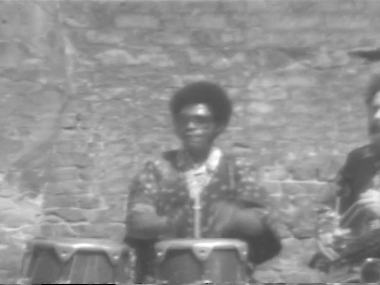 In this black-and-white handheld video from the Basement Project, a primarily Black music troupe featuring steel pan players, percussionists, brass section, singers, and dancers takes a group of East End children through a crash course in how to play instruments, followed by some live tunes and performances by the band. The band leader teaches children about the symbolism of an African statue through a folk-tale, as well as the origins of the steel-pan drum in Trinidad. All this activity takes place in what appears to be the ruined foundations of a former building, with passers by watching the band from street level and an audience perched on a crumbling wall.