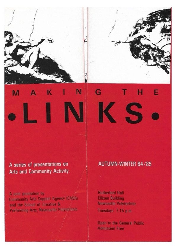 Making the Links is a catalogue of a series of presentations by Tony Dowmunt, Graham Marsden, Karen Merkel and John Fox across Autumn 1984 to 1985 around community arts and eduction, jointly promoted by the Community Arts Support Agency (CASA) and the School of Creative & Performing Arts at Newcastle Polytechnic.